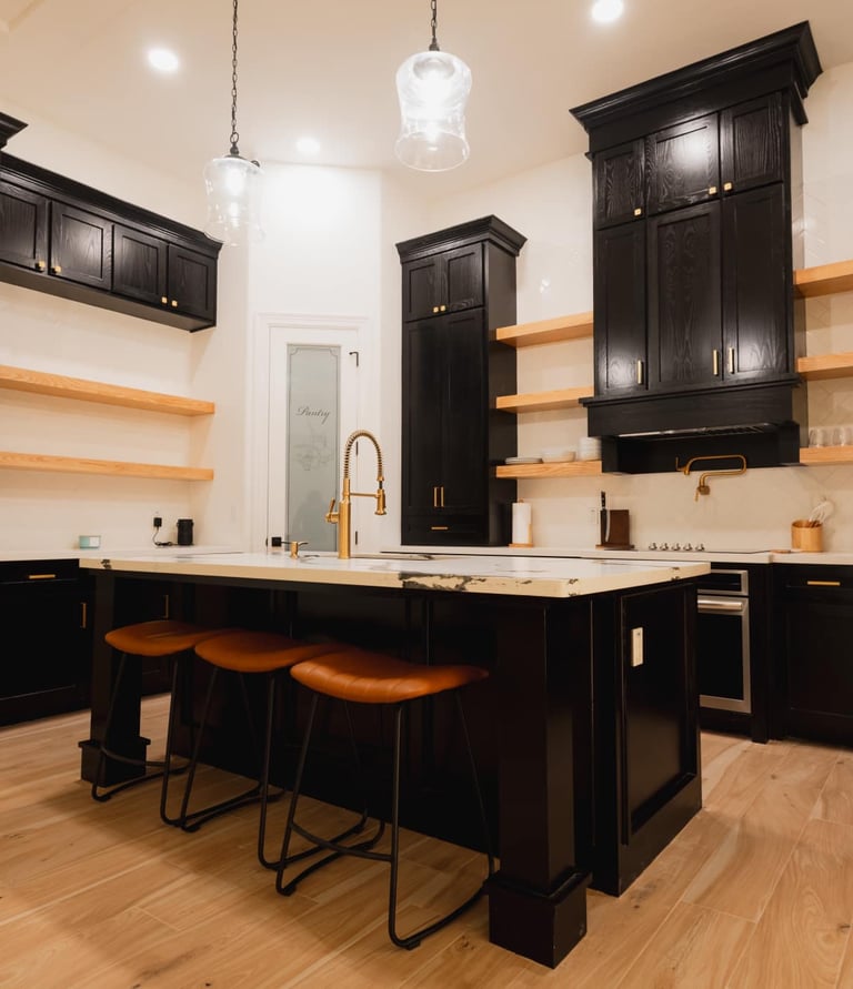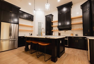 Sometimes blending together different styles can work well. This is a blend of Contemporary (Dark colors, straight lines and sharp edges) + Farmhouse (open wood shelves, wood accents, white or light colors). Whatever your style, we can bring it to life!