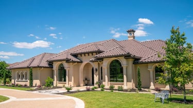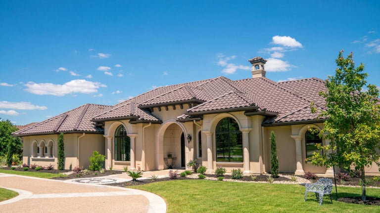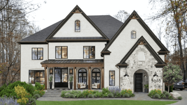 Tudor homes are inspired by the Tudor period in England, characterized by their half-timbered construction, steeply pitched roofs, and often combining stone/stucco or brick/stucco.