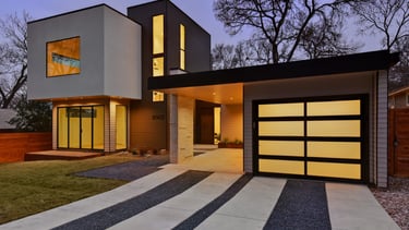 Clean lines, large glass, flat/low-slope roofs, minimal trim, mixed modern materials.